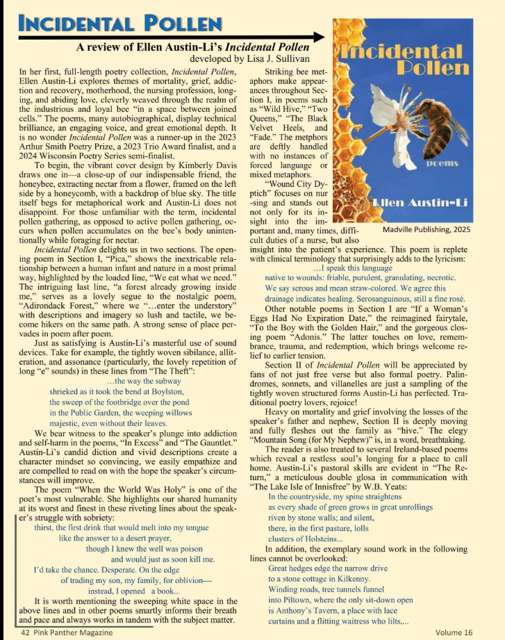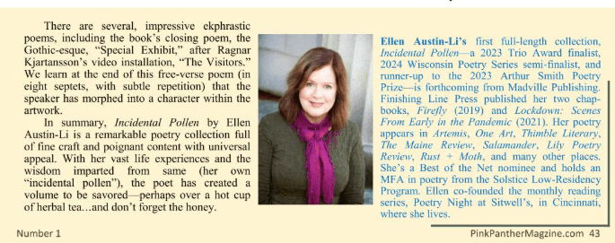 I’ve neglected posting blog entries for many months (a mixture of grief and the state of the country) and was certainly remiss in not sharing this book review, written by poet and artist Lisa Sullivan, when the March 2025 issue of Pink Panther Magazine went to print. I posted the link to Pink Panther Magazine on the home page, as this is a publication worth purchasing. The visual art is every bit as arresting as the poetry and prose found on the pages. It truly is a beautiful product! I hope you’ll take a look at Mag Cloud, where the ordering and digital copy reside (this is where Pink Panther‘s webpage will lead you).