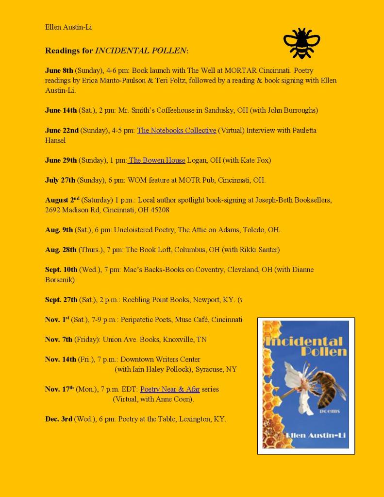 –Feb. 20th, 7-9 p.m.: Incidental Pollen reading, followed by Q & A and a book signing at Women Writing for a Change (WWFaC), 6906 Plainfield Rd, Cincinnati, OH 45236
